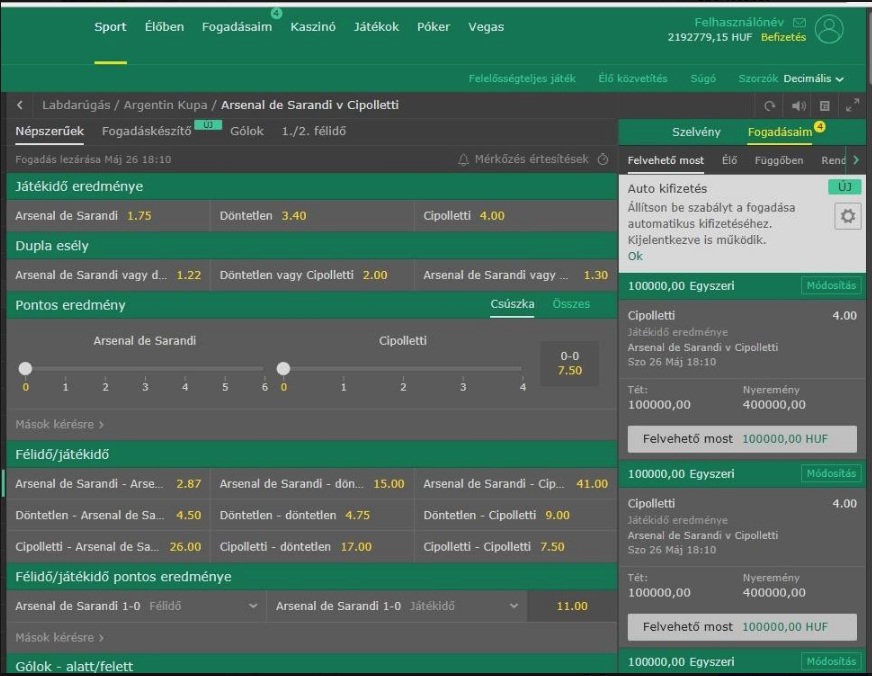Argentin kupameccs ahol a vendégre 4.0 szorzóval lehet fogadni és ő ezt 4 részletben megpakolta összesen 400.000Ft-all. Kicsit szétszedném ezt a tippet: Először is ha valaki 400.000Ft téttel fogad az azt jelenti hogy neki 10 és 20 millió Ft közötti bankrollal kellene rendelkezzen, attól függően hogy 4% vagy 2%-os tétméretet használ. (Meg kell említsem, hogy ekkora oddsos fogadásoknál, még kisebb tétméret lenne a reális, ami 40-50 millió Ft bankrollt igényelne de ettől most tekintsünk el.)