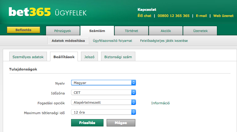(Néhányan írtak azzal kapcsolatban hogy átállítják a nyelvet angolra és bejelentkezés után visszaáll magyarra. Persze hogy visszaáll mivel az az alapértelmezett beállításod. Azaz azt kell megváltoztatni. 1.) belépsz a bet365 fiókodba. 2.) jobb felül látod az egyenlegedet mellette sárga betűkkel a befizetés opciót, rákattintasz és bejön egy kis ablak. 3.) Ott a legfelső fülek közül balról a másodikat választod a „számlám”-at! 4.) Majd kiválasztod a legalsó 4 fül közül ismét balról a másodikat „Beállítások” Átállítod a nyelvet Angolra. 5.) A maximum tétlenségi időt átállítod 12 órára hogy minél később léptessen ki a fiókból így kevesebbszer kell belépned. Rákattintasz a Zöld „Frissítés” gombra. 6.) Zárd be a kis ablakot majd frissítsd a weboldalt. 7.) Ha így sem lett angol akkor lépj ki és lépj be, ezután biztosan működnie kell!)